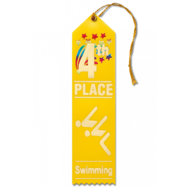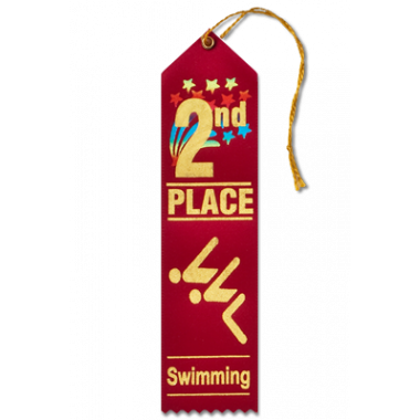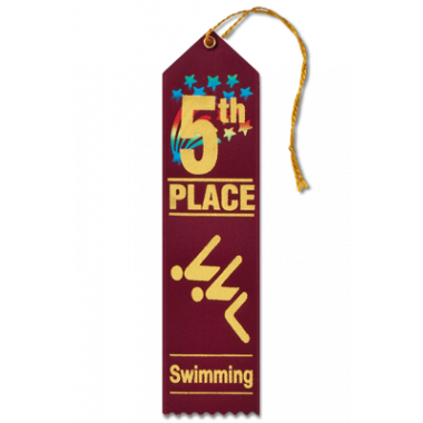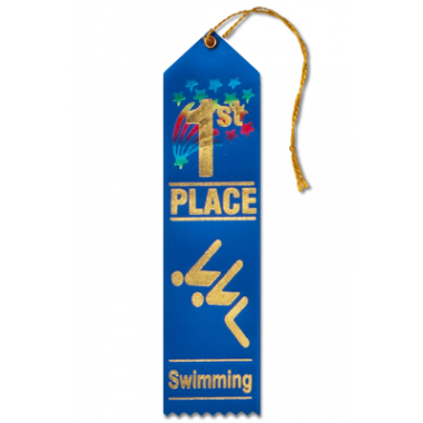 Stock 2x8 swimming ribbons with bright multi-color stars and a classic "Olympic" style swim graphic will be a hit with the your swimmers and easy on your swim meet awards budget! Event tag for recording details and a string for hanging are included. We combine the quantities from each title to give you the best price possible.